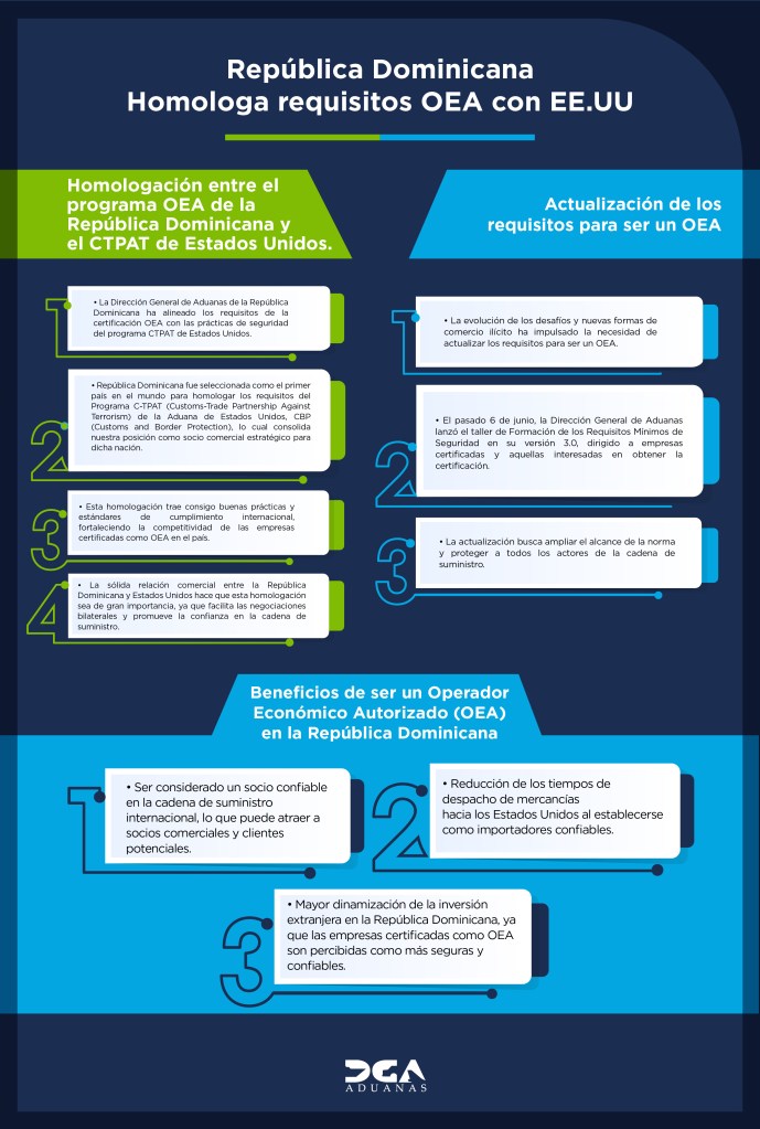 “Esta estandarización de requisitos es un paso más para la aduana dominicana, para las empresas que hacen negocios desde aquí, y para el posicionamiento del país como un hub logístico de clase mundial”, manifestó el director general de Aduanas, al dar a conocer la información.