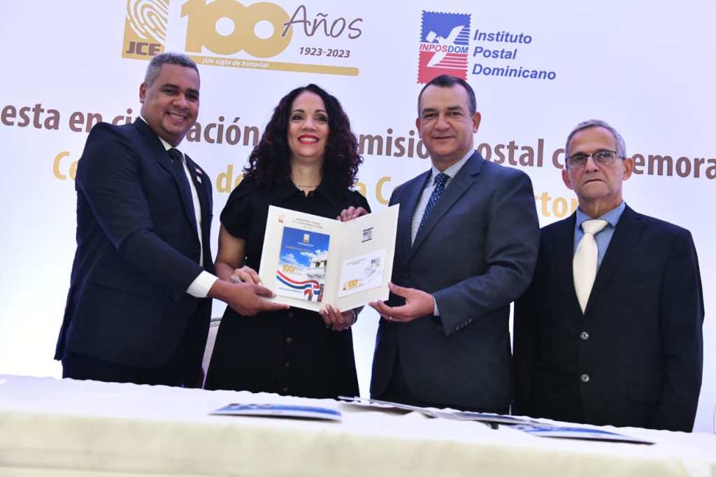 Santo Domingo. – La Junta Central Electoral (JCE) y el Instituto Postal Dominicano (Inposdom) pusieron en circulación la emisión del sello postal del órgano electoral, en el marco de las actividades conmemorativas del 100 aniversario de la institución, creada el 12 de abril de 1923.