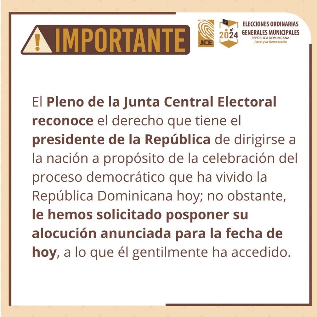 «El Pleno de la Junta Central Electoral reconoce el derecho que tiene el presidente de la República para dirigirse a la nación, a propósito de la celebración del proceso democrático que ha vivido la República Dominicana hoy; no obstante, le hemos solicitado posponer su alocución anunciada para la fecha de hoy, a lo que él gentilmente ha accedido» informó la Junta en un comunicado.