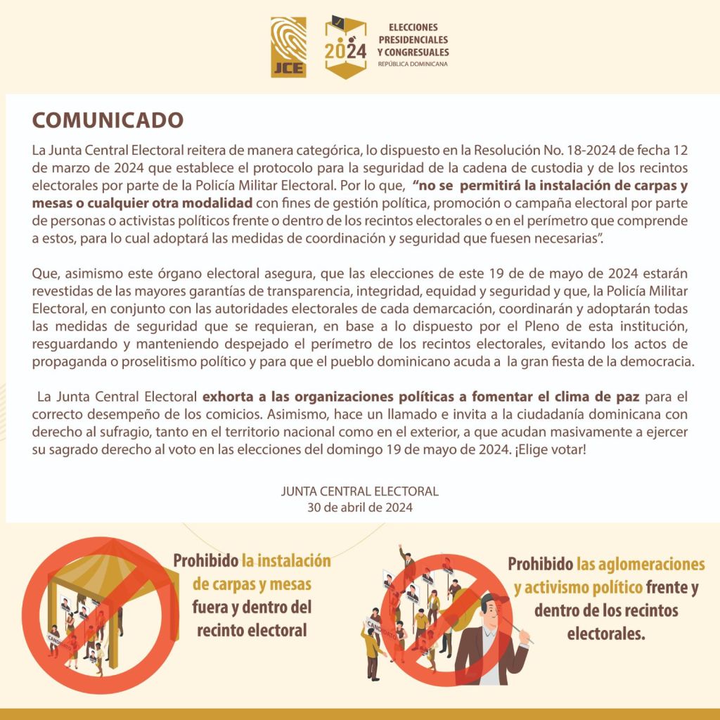 Santo Domingo . República Dominicana.- La Junta Central Electoral (JCE) reiteró hoy que no se permitirán carpas ni mesas de partidos en los recintos de votación el día de las elecciones del próximo 19 de mayo.