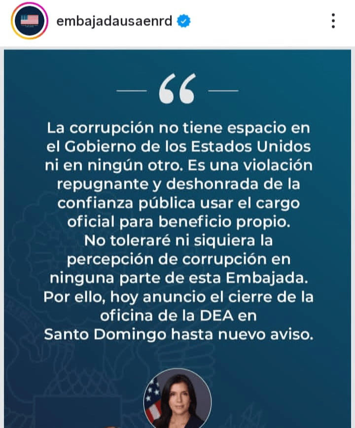 “La corrupción no tiene espacio en el Gobierno de los Estados Unidos ni en ningún otro. Es una violación repugnante y deshonrada de la confianza pública usar el cargo oficial para beneficio propio. No toleraré ni siquiera la percepción de corrupción en ningún lugar de la Embajada que dirijo. Por ello, hoy anuncio el cierre de la oficina de la DEA en Santo Domingo hasta nuevo aviso.” Establece el comunicado emitido por la funcionaria diplomática en la cuenta de instagram de la Embajada