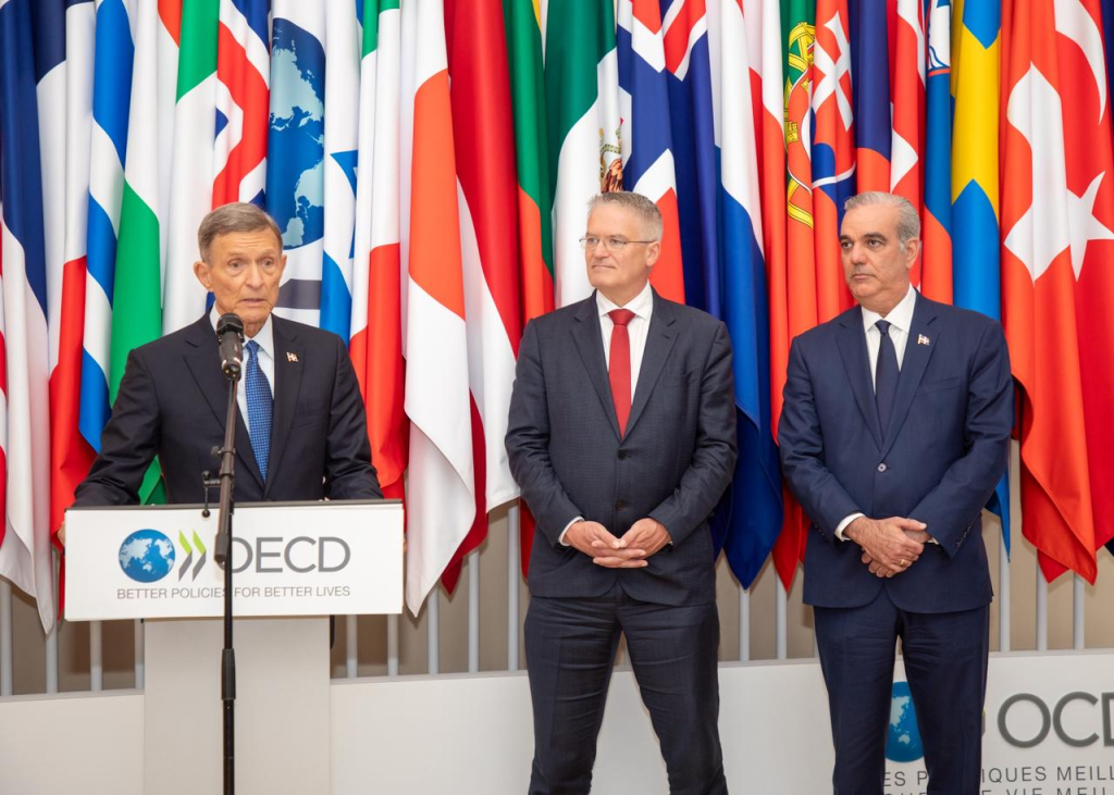 París, Francia. – En presencia del presidente Luis Abinader, el canciller Roberto Álvarez y el secretario general de la Organización para la Cooperación y el Desarrollo Económico (OCDE), Mathias Cormann, firmaron un Memorando de Entendimiento con el que las partes formalizan su acercamiento y buscan fomentar la cooperación, impulsar el intercambio de buenas prácticas, así como apoyar el fortalecimiento de políticas públicas conforme a estándares internacionales.