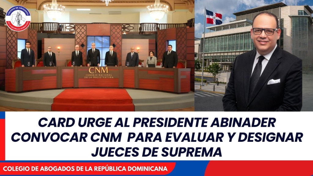 Santo Domingo, RD.– El Colegio de Abogados de la República Dominicana (CARD) pidió al presidente de la República, Luis Abinader, en su condición de presidente del Consejo Nacional de la Magistratura (CNM), a convocar de manera urgente a ese órgano constitucional para iniciar el proceso de evaluación y selección de los nuevos integrantes de la Suprema Corte de Justicia (SCJ).